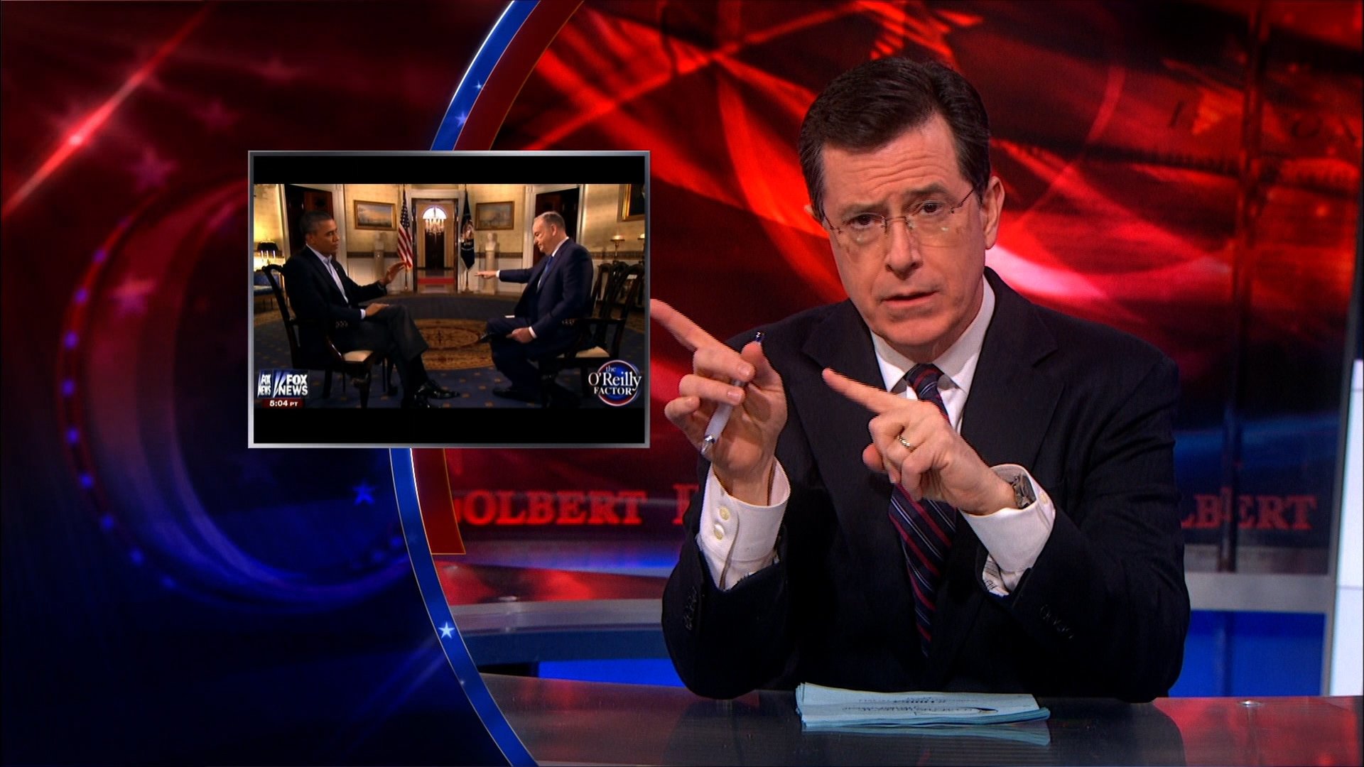Stephen attends the White House State Dinner, Bill O’Reilly gloats over his Obama interview, Shepard Smith recites the White House menu, and Godfrey Reggio talks “Visitors.”